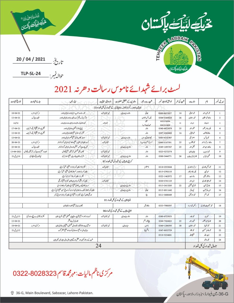 TLP publishes list of its workers who were martyred by vicious brutality of LEAs on peaceful sit-ins of Tehreek Labbaik Pakistan in last April for expulsion of French ambassador over govt. backed blasphemy by Charlie Hebdo.