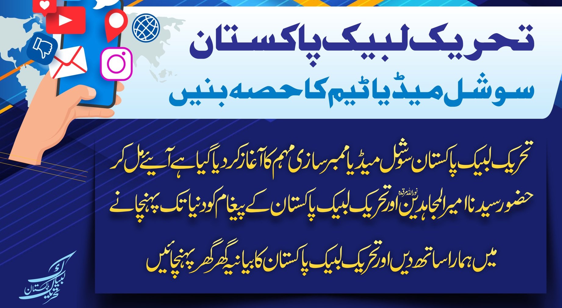 تحریک لبیک پاکستان سوشل میڈیا ٹیم ممبر سازی مہم کا آغاز کردیا گیا ہےآیئےمل کر حضور سیدنا امیر المجاہدین نور اللّٰہ مرقدہ اور تحریک کے پیغام کو دنیا تک پہنچانے میں ہمارا ساتھ دیں